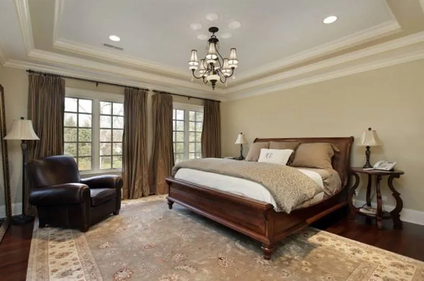 В качестве более оригинального способа украшения потолка рассмотрите зиг-заг или волну, но учтите: свет обязательно должен падать на шкаф с одеждой и зеркало.