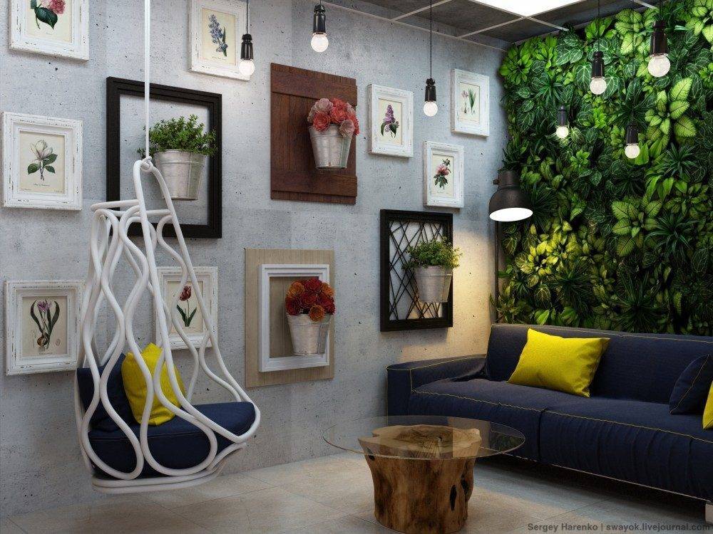 Декоративные элементы в интерьере практически отсутствуют. Приветствуются настенные украшения в виде плакатов, граффити. Именно установка разнообразных светильников позволяет придать квартире обжитой и уютный вид.