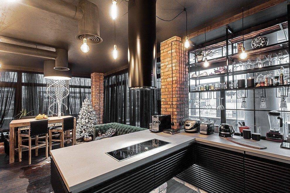 - Кухня с «комнатным» светом. Использовать на кухне торшеры на ножках, настольные лампы и настенные канделябры не рекомендуется. Все необходимое для кухни-Лофт умещается в потолочную категорию.