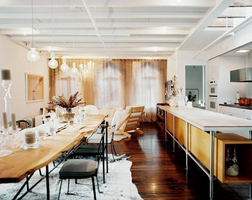 - Открытая планировка. Никаких отдельных комнат и перегородок. В стиле лофт разделение пространства на зоны осуществляется с помощью мебели и многочисленных источников света: настенных, напольных, настольных, подвесных, точечных светильников. Чем больше их будет, тем лучше.