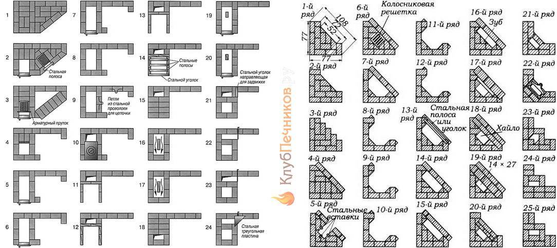 Если же учесть, что вынос основания печи за контуры ее тела в плане должен быть не менее 50 мм, то экономия места оказывается иллюзорной. Но взамен появляется до 2 кв. м жилой площади, не пригодной ни для чего более, как для сборки в себе мусора. Тем менее, на след. рис. мы приводим порядовки двух компактных угловых печей: слева – отопительно-варочной, а справа – печи-камина.
