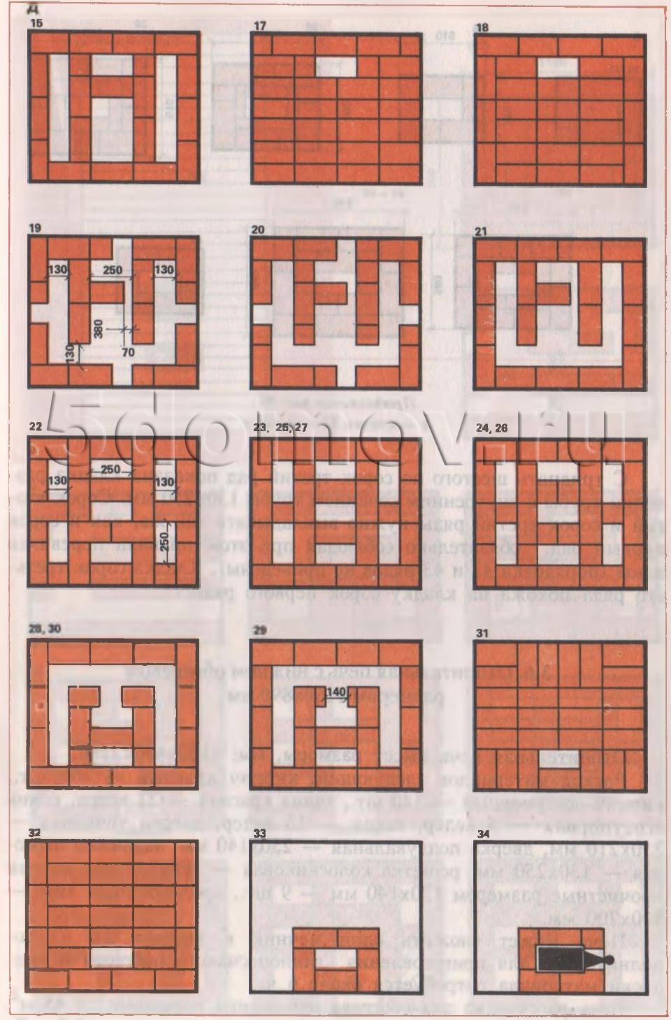 Чертежи разрезов и порядовки кладки печи приведены на рис. 4. Кладку печи выполняют согласно порядовкам, соблюдая правила перевязки швов.
