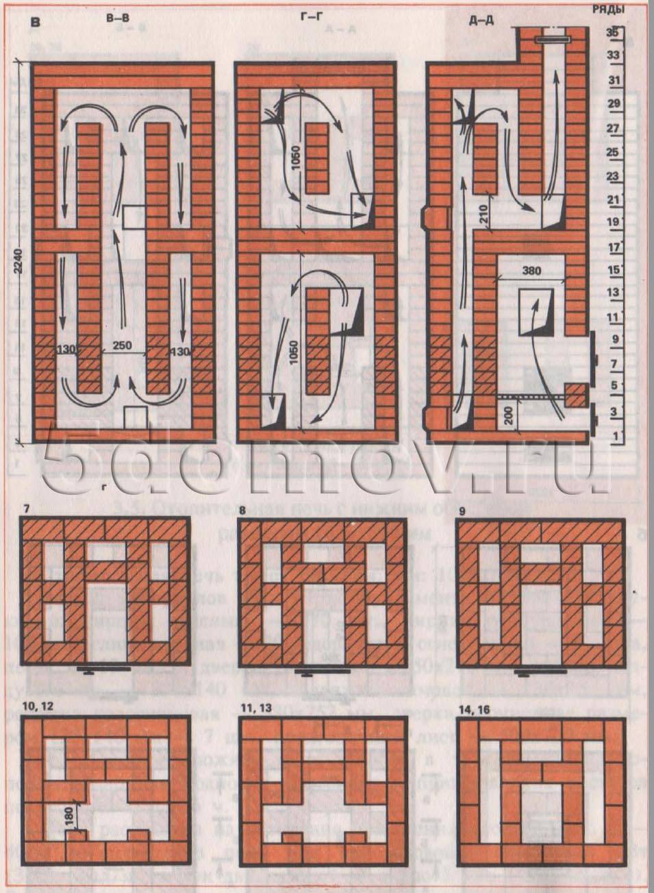 Рис. 2. Отопительная печь с нижним обогревом размером 770×770 мм а — фасад; б — разрезы А-А, Б-Б; в — кладка 1 -13 рядов; г — разрезы В—В, Г—Г; д — кладка 14—35 рядов; 1 — дымовая задвижка; 2 — отверстия для чистки; 3 — топочная дверка; 4 — поддувальная дверка; 5 — топливник; 6 — колосниковая решетка; 7 — зольниковая камераРис. 2. Отопительная печь с нижним обогревом размером 770×770 мм г — разрезы В—В, Г—Г; д — кладка 14—35 рядов; 1 — дымовая задвижка; 2 — отверстия для чистки; 3 — топочная дверка; 4 — поддувальная дверка; 5 — топливник; 6 — колосниковая решетка; 7 — зольниковая камера