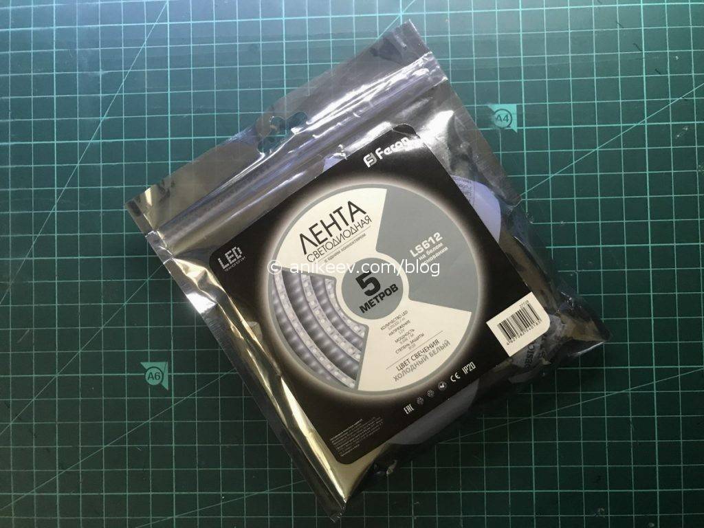Купил в местном магазине самую обычную светодиодную ленту, не заморачиваясь характеристиками, теплотой цвета и прочими штуками. У меня просто не было вариантов. Точнее, было два: либо лента на 60 светодиодов (три диода на отрезок 5см), либо лента на 120 светодиодов (три диода на 25мм) — это в одном метре. Я выбрал второе: так и зазор между диодами меньше, и ленту по месту можно отрезать точнее.