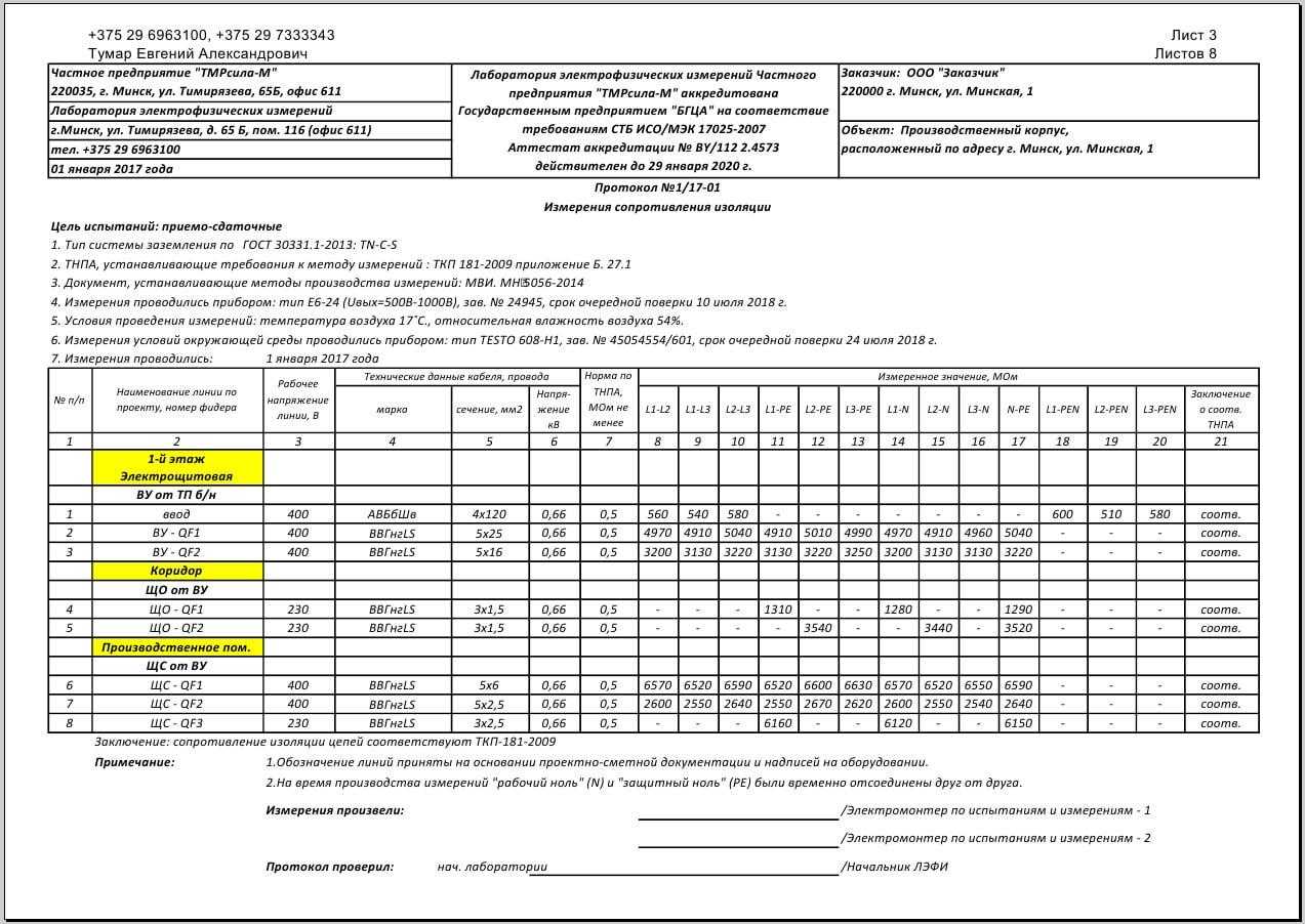 В бытовых однофазных цепях вполне достаточно будет провести три замера. В последних строчках заполняемого протокола обязательно должна присутствовать фраза о соответствии полученных результатов требованиям ПУЭ.
