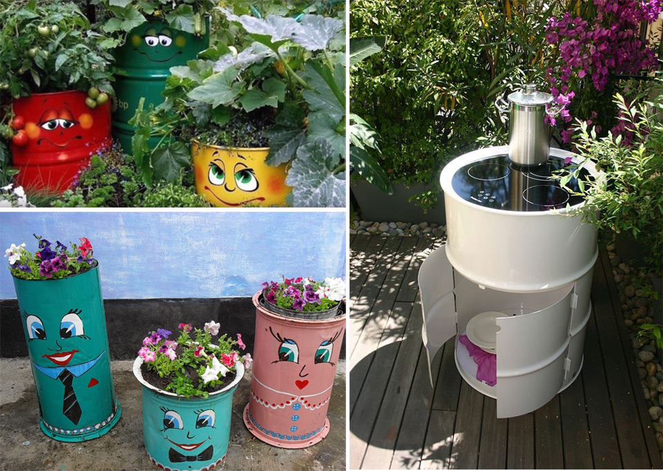 Бочку можно оплести ивовыми прутьями или виноградной лозой. Отличный вариант декора: ракушки, камушки, разбитая керамическая плитка, мозаика, осколки зеркал (лучше без детей), крышки от банок и бутылок. Можно украсить емкость текстилем, придав ей вид какой-нибудь фигуры, например, сказочного персонажа.