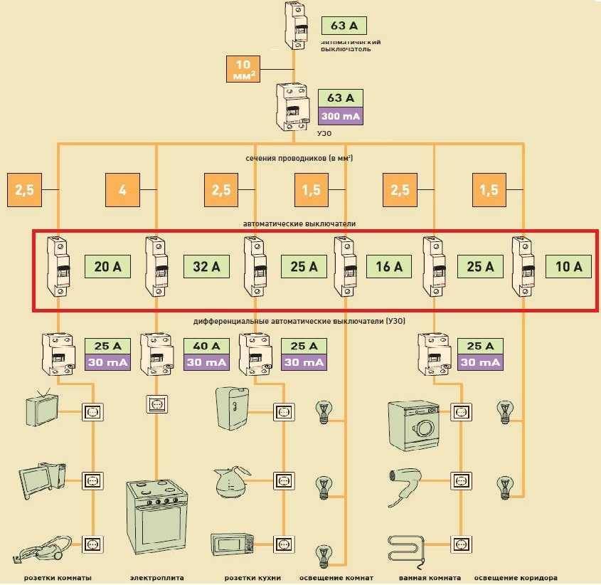 | 2,5 кв. мм | 27 А | 5,9 кВт | 16 А | 25 А | розеточные группы и электрический теплый пол |