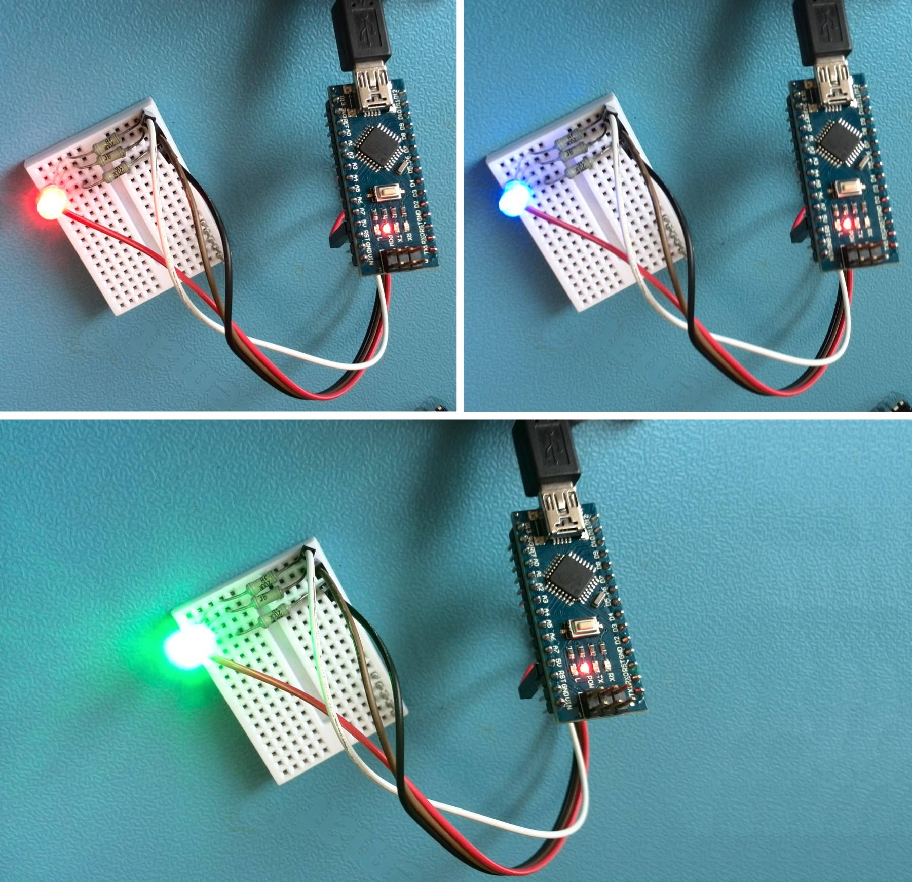Посмотрим в действии на мигание RGB светодиодом. Светодиод по очереди зажигается красным, зелёным и синим цветами. Каждый цвет горит 0,1 секунду, а затем гаснет на 0,2 секунды, и включается следующий. Можно зажигать каждый канал отдельно, можно все одновременно, тогда цвет свечения будет меняться.