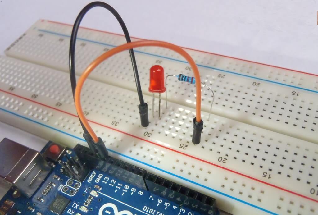 Для чего светодиод включают к Ардуино с резистором? Дело в том, что в светодиоде стоит кристалл который боится больших токов. Резистор призван ограничивать силу тока (Амперы), чтобы светодиод не перегорел. Большой ток губителен для светодиода, меньший ток (благодаря подключению резистора) обеспечивает длительную работу. Чтобы подключить светодиод к Ардуино без резистора, используйте 13 порт.