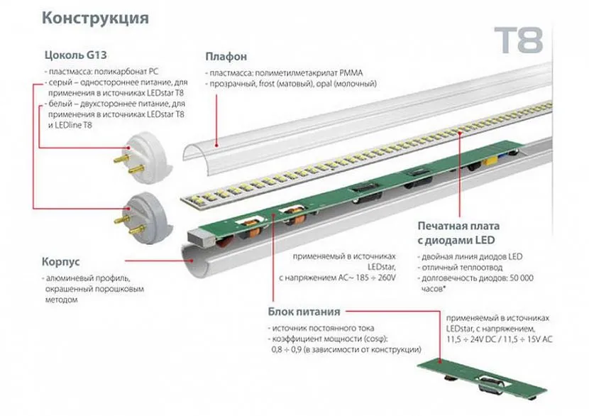 Светодиодные изделия имеют стандартный цоколь G13, при этом внутри при помощи медной проволоки колбы происходит соединение между штырями лампы. Благодаря этому электричество можно подавать по любому штырьку.
