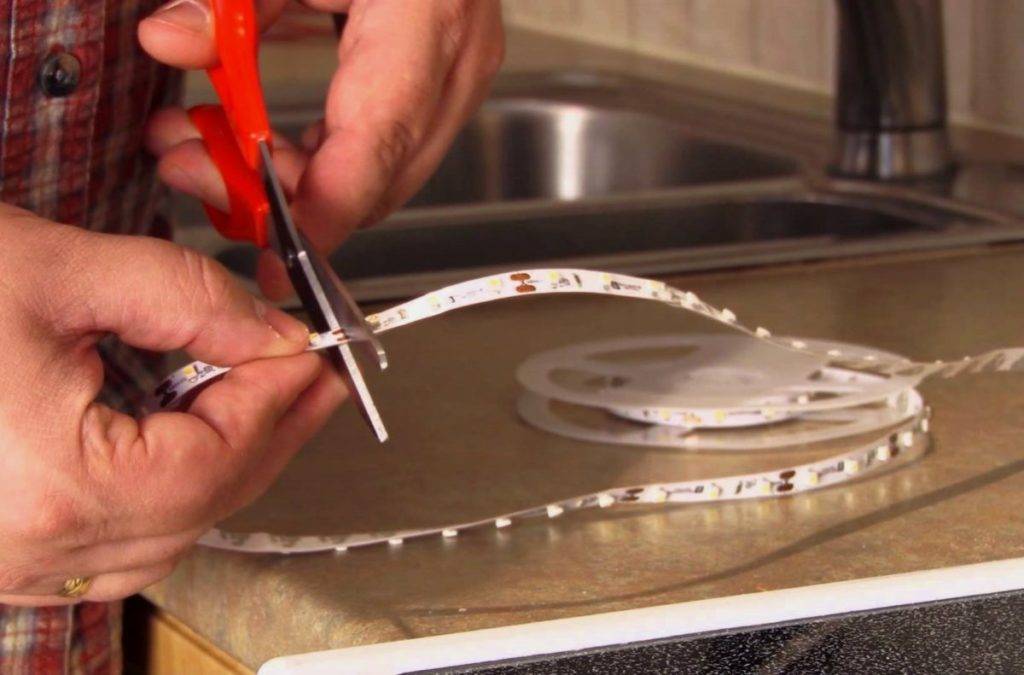 - Провести замеры, чтобы точно определить длину кусков светодиодной ленты. Резать ее можно только в определенных местах, поэтому длину элементов нужно подбирать с учетом этого момента. Резать по линии, где есть контакты для подключения.