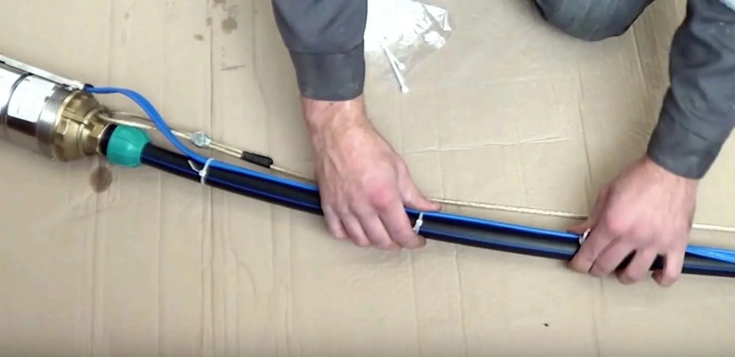 В итоге от насоса должны идти: шланг, капроновый трос и электрический провод. В нескольких местах их соединяют между собой скотчем. Интервал между соединениями должен составлять 1- 2 метра. Первое такое соединение должно располагаться от корпуса насоса на расстоянии не более 20 сантиметров. Когда насос работает, довольно часто бывает вибрация, которая способствует соприкосновению устройства со стенками узкого колодца или обсадной трубы в скважине. В результате корпус повреждается и это может привести к поломке всего устройства. Для предотвращения этого перед погружением насоса на него следует надеть кольцо из резины. Оно будет амортизировать возможные удары и обеспечит дополнительную защиту корпуса.
