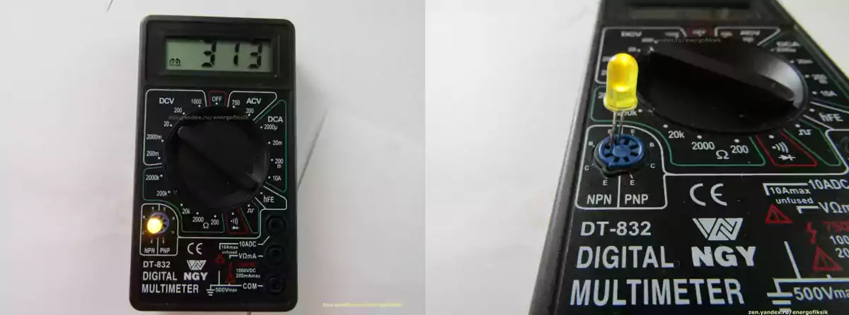 В-третьих, многие тестеры позволяют проводить измерения вообще без щупов. Мультиметр должен иметь специальный раздел для проверки транзисторов PNP и NPN. У них контакты помечены буквами «Е» и «С». При проверке элемента в зоне ПНП, если катод вставить в разъем «С», а анод в «Е», светодиод начнет излучать свет. Следовательно, полярность определенно правильная.