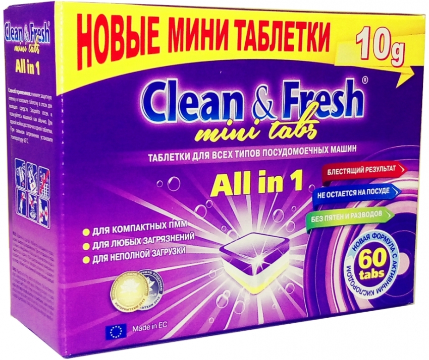 Clean & Fresh All in 1. Эти таблетки, по заверениям потребителей, лучше всего справляются с очисткой посуды. Данный продукт производится немецкой компанией, которая специализируется на изготовлении и продаже бытовой химии. Такие средства по праву считаются универсальными, так как способствуют отмыванию изделий из серебра, фарфора, стекла, керамики, нержавейки и т.д. Цена таблеток для посудомоечной машины этого типа составляет приблизительно 600 руб.