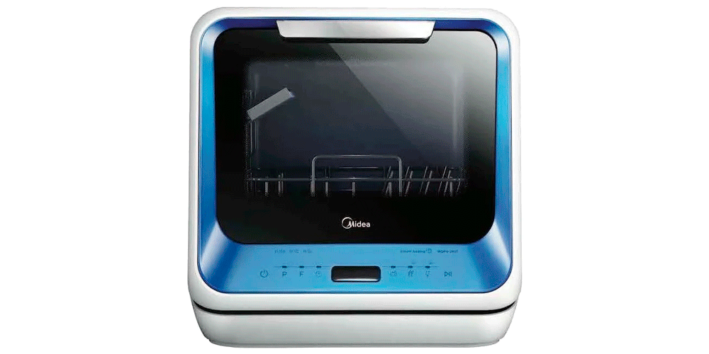 Настольная посудомойка с электронной системой управления и вместительной рабочей камерой. С ее помощью можно отмыть до 8 комплектов посуды. Высота модели составляет 59,5 см, ширина – 55 см, глубина – 50 см. Тяжелая, весит 23,31 кг. На одну стирку расходуется около 8 литров воды.