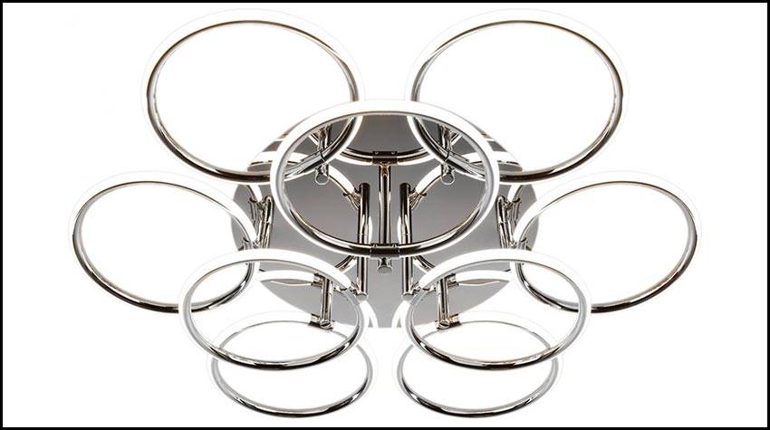 Пожалуй, самая необычная модель в нашем рейтинге люстр. Изделие включает основу для крепления и три присоединенных к ней кольца. Расположение колец не статично. Его можно корректировать в соответствии с имеющимися пожеланиями, причем речь об изменении не только углов наклона, но и высоты размещения элементов.