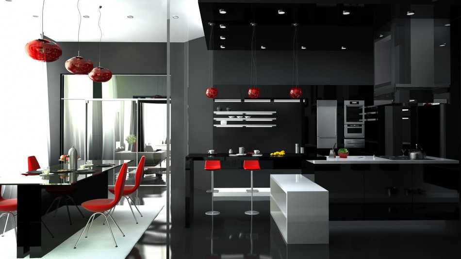 На следующем примере вы можете увидеть люстры для кухни в стиле хай тек, которые дают необходимый при работе свет, ведь хорошая видимость в этой зоне – это одно из главных требований при ее оборудовании. Отдельно используется подсветка рабочей поверхности, а отдельно вешается большой светильник над обеденным столом. На примере это единый трехрожковый подвесной светильник, несколько одинаковых ламп с абажурами под цвет интерьера или же один стеклянный светильник замысловатой, абстрактной формы, который вешается достаточно высоко над столом.