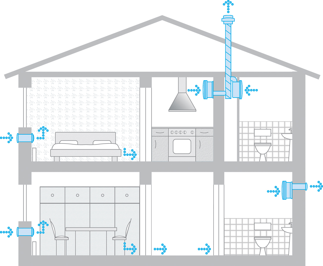 Система вентиляции большинства квартир, расположенных в домах старой постройки, основана на естественной циркуляции воздушных масс. Аналогичная схема используется для создания воздухообмена в частных домах и общественных зданиях небольшой площади. Свежий воздух поступает в помещение сквозь окна и двери, а выводится наружу через общий вентиляционный канал (в частных домах сквозь потолок и специальные продухи).