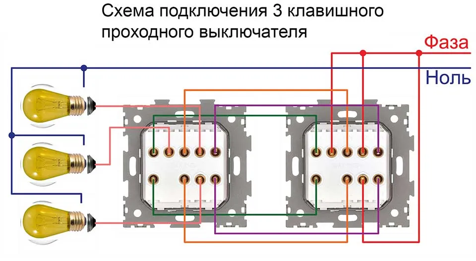 Схема подключения двухклавишного и трехклавишного выключателей