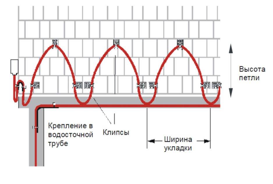 Конструкции скатных крыш разные, но в одном можно быть уверенным, все они имеют карниз. То есть имеется участок кровли по нижней части крыши, собственно по нему и прокладывается кабель в виде змейки. Ширина змеевика провода выставляется произвольно, но чаще в 50 см, с шагом от 10 до 30 см. Остальная его часть проходит по водосточной системе крыши.