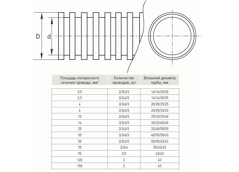 Таблица выбора гофрированных труб в зависимости от количества проводов и размеров сечения