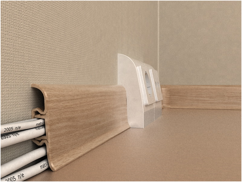 К скрытой разводке кабеля относят и разводку в электротехническом плинтусе. Такой плинтус изготавливается из пластика и имеет отсеки для крепления силовых или сигнальных кабелей. Для подводки кабеля от плинтуса к розетке или выключателю используют либо кабельные каналы, либо укладку между несущей стеной и декоративной отделочной панелью.