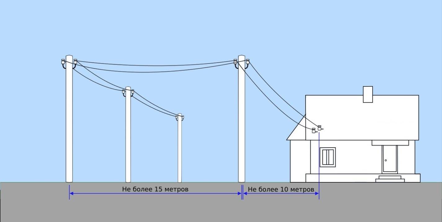 – воздушный. Этот способ используется в том случае, когда жилое здание достаточно удалено от подстанции. В таком случае кабель вместе с несущим тросом фиксируется от жилого дома до опорного строения. В месте прохождения силового кабеля через несущую стену монтируется металлическая гильза из толстостенных труб.
