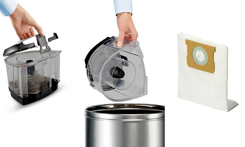 - С мешком для сбора мусора. Мешки могут быть многоразовые или одноразовые. Многоразовые надо вытряхивать, одноразовые — просто менять. Но одноразовые надо покупать и иметь в запасе. Если модель будет снята с производства, через какое-то время мешки из продажи исчезают. И не факт, что подойдут другие.