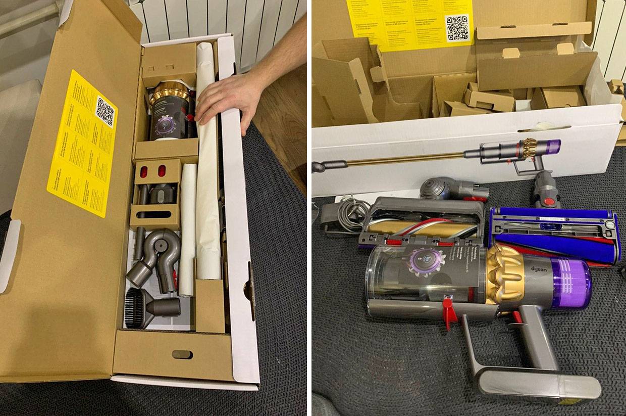 Коробка Dyson V11 Absolute Pro обманчиво компактная, тяжёлая. Муж встретил курьера и помог занести на этаж, после чего принялся распаковывать его сам.