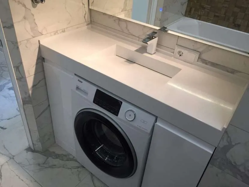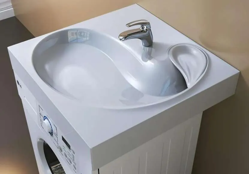 Некоторые дизайнеры предлагают врезать раковину в столешницу прямо над стиралкой. Но этот вариант довольно сложен из-за стеснённости расположения коммуникаций в скрытом пространстве за агрегатом и практически не применяется.