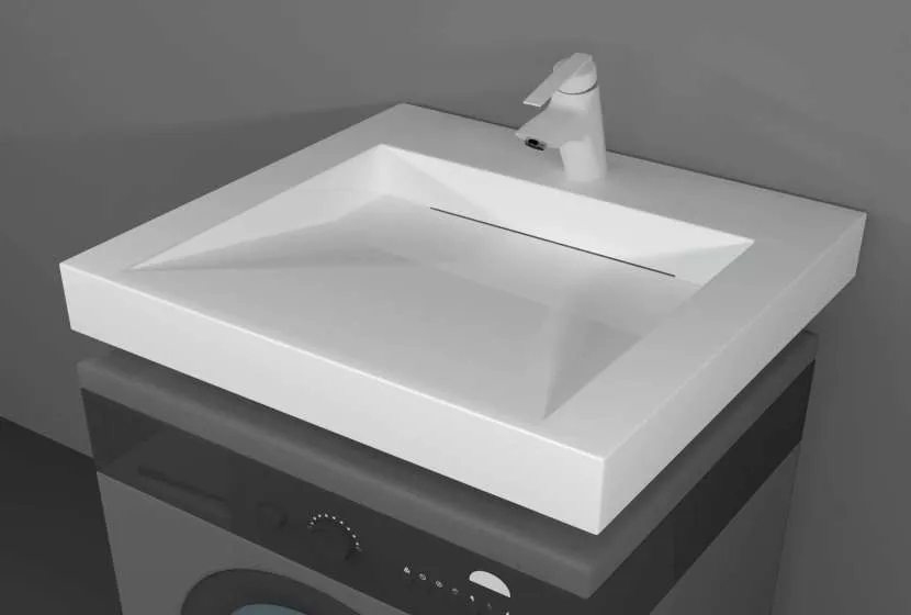 Этот материал имеет меньший вес по сравнению с натуральным камнем, который из-за большого веса не используют для изготовления раковин, монтируемых над стиральной машинкой. При этом искусственный камень имеет практически точно такие же характеристики, как и природный материал. Он не требует особого ухода, позволяет изготовить умывальники достойного внешнего вида, обладает высокой прочностью и долговечностью. При этом искусственный камень дешевле натурального аналога. Его изготавливают из полимера, который смешивают с каменной крошкой.