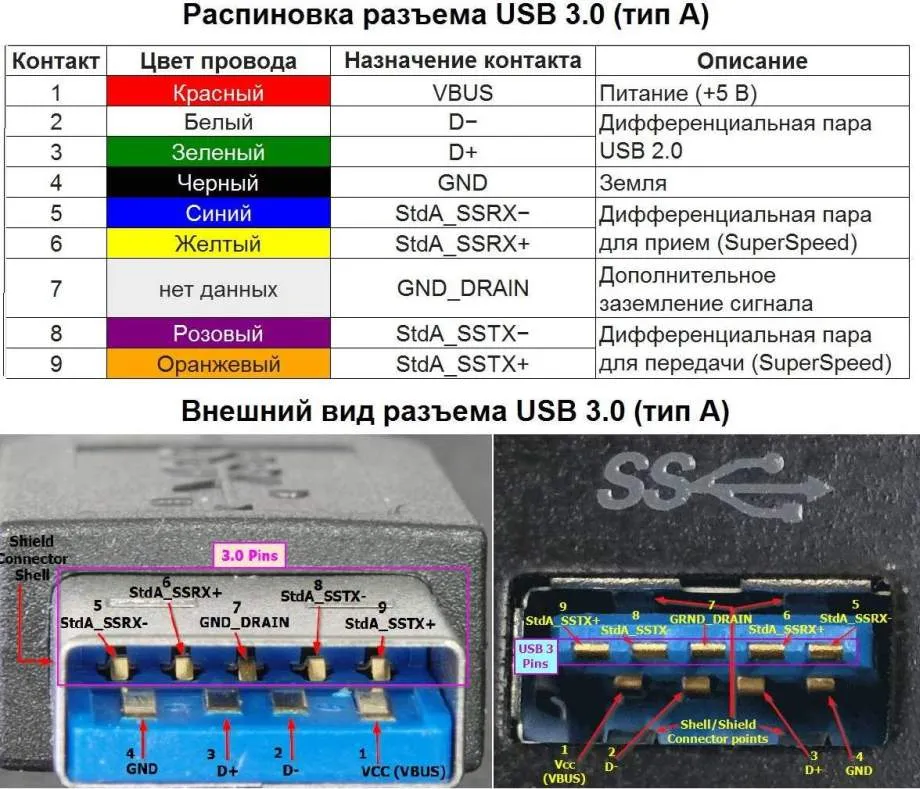 Распиновка и внешний вид разъема USB 3.0, тип А