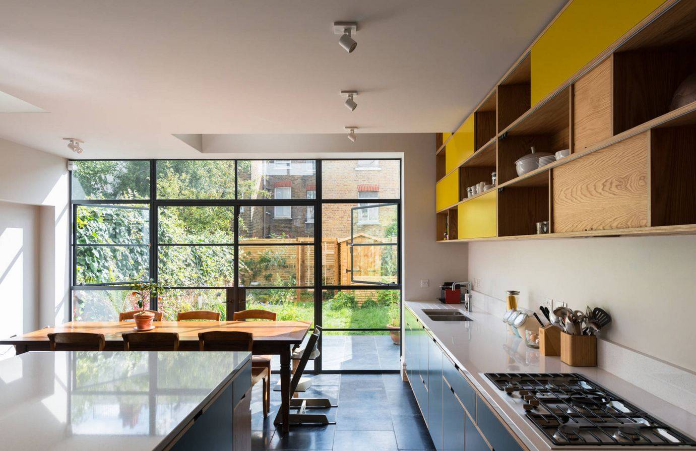 Люстру можно сместить, расположив над столовой зоной. А в маленькой кухне — и вовсе обойтись только встроенными приборами, разместив их вторым рядом.
