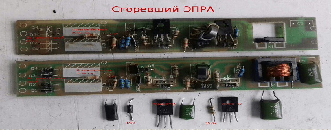 Также в схеме присутствует еще одно слабое место – низкоомный предохранитель в 2–5 Ом. Очень редко причина может быть в сгоревших элементах диодного моста. Это все возможные причины, после их устранения и будет закончен ремонт балласта, т. е. восстановление сгоревшего электронного пускорегулирующего аппарата.