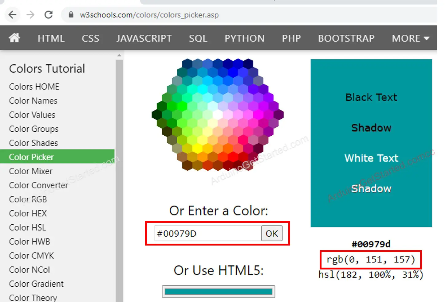 Convert color code to R, G, B values using the tool from w3school. Take note these values. in this case: R = 0, G = 151, B = 157