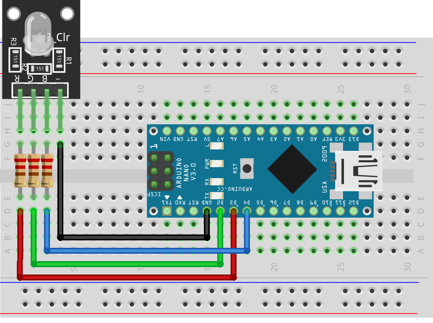 Данное изображение представляет собой схему Arduino Nano со светодиодом RGB.