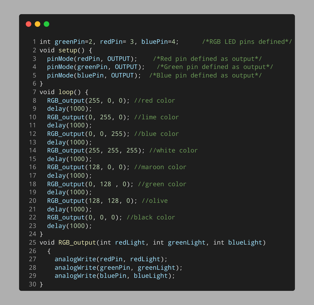 пустая петля(){ RGB_выход(255, , ); //Установите цвет RGB на красный задерживать(1000); RGB_выход(, 255, ); //Установите цвет RGB на лайм задерживать(1000); RGB_выход(, , 255); //Установите цвет RGB на синий задерживать(1000); RGB_выход(255, 255, 255); //Установите цвет RGB на белый задерживать(1000); RGB_выход(128, , ); //Установите цвет RGB на бордовый задерживать(1000); RGB_выход(, 128, ); //Установите цвет RGB на зеленый задерживать(1000); RGB_выход(128, 128, ); //Установите цвет RGB на оливковый задерживать(1000); RGB_выход(, , ); //Установите цвет RGB на черный задерживать(1000);}