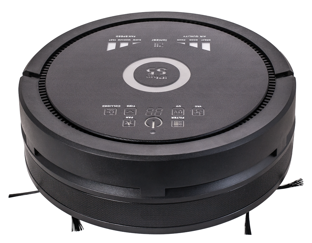 У робота-пылесоса iPlus S5 традиционная круглая форма, лаконичный дизайн, надёжный корпус из прочного пластика чёрного цвета. Небольшие размеры: диаметр 300 мм, тонкий корпус высотой 70 мм без модуля очистки.