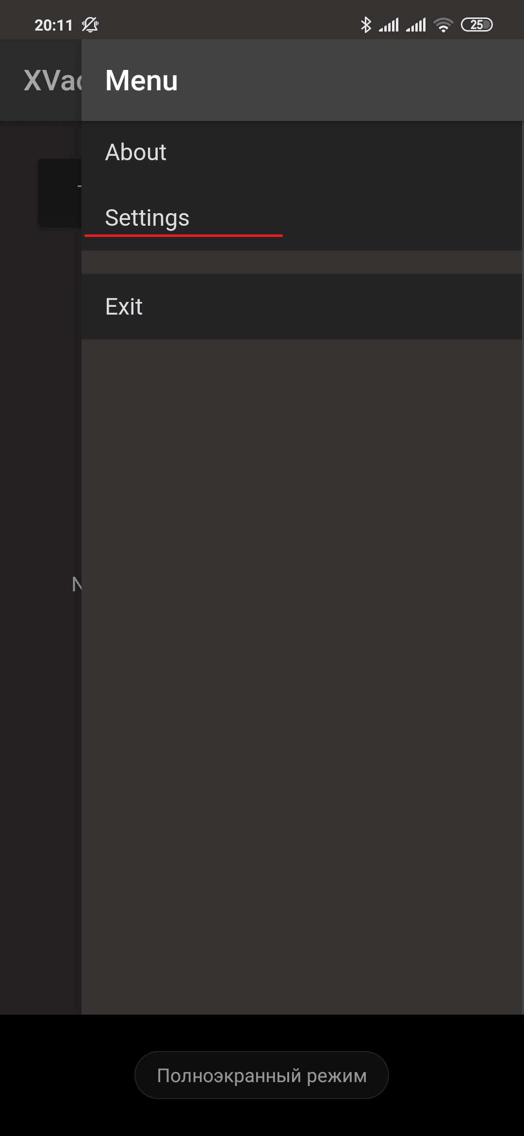 Открываем приложение Xvacuum Firmware и нажимаем натри горизонтальных полосы в правом верхнем углу, перед нами откроется меню в котором выбираем Settings,
