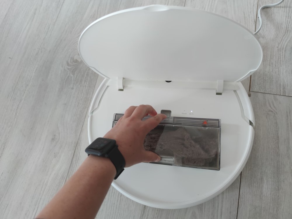 Сверху на крышке всего две кнопки – включения и отправки на базу, плоский глазок навигационной камеры и логотип MI. Под мягко открывающейся крышкой – контейнер для сбора пыли, кнопка reset и лампочка сигнала wi-fi.