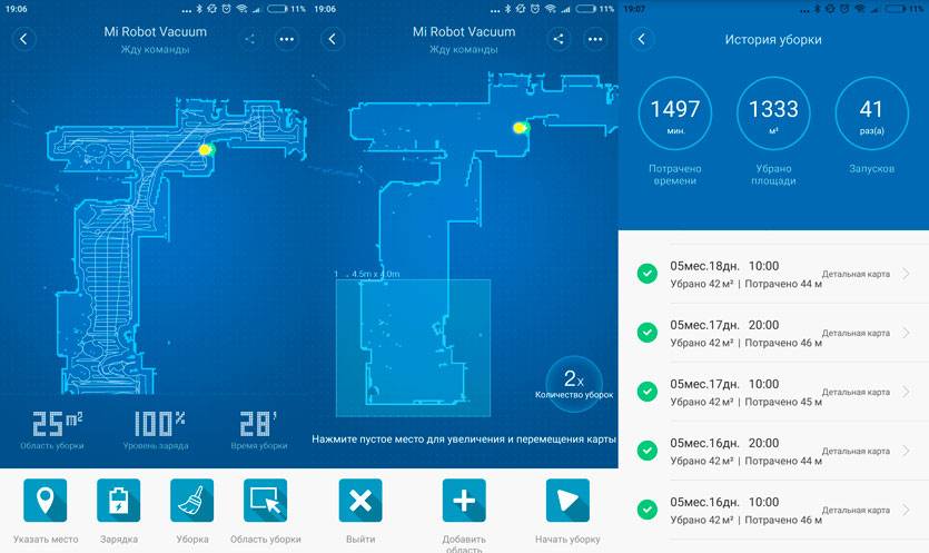 Mi Robot Vacuum Cleaner производит очистку помещения до 20-процентного заряда батарее. После чего отправляется на подзарядку к базе. Восполнив заряд, возвращается к работе с места, где была прервана уборка.