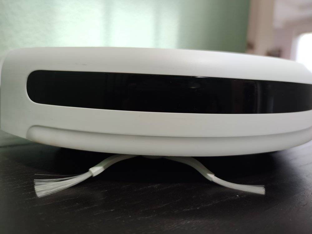 Спереди на корпусе проходит черная глянцевая полоса, под которой размещены инфракрасные датчики (их 7 штук), которые спасают пылесос от столкновений с предметами при уборке. Радиус их действия — до 20 см. Также благодаря им пылесос замедляется при возвращении на базу для зарядки.
