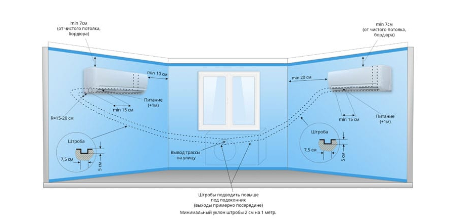 Расположение точки питания кондиционера по высоте будет подчиняться следующим правилам: