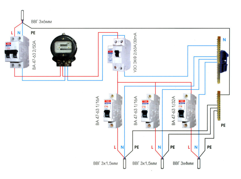 Имейте в виду, что широкое распространение получила ещё одна разновидность такой схемы, в ней между вводным автоматом и УЗО принято устанавливать счётчик электрической энергии.