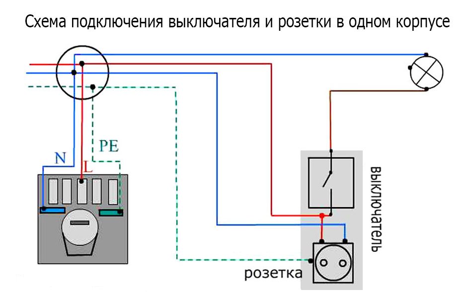 Фаза (на схеме провод красного цвета) подключается на один вывод розетки. С этого же вывода идет перемычка на общий контакт (клемму) двухклавишного выключателя. Ноль (на схеме провод синего цвета) подключается к другому выводу розетки. Защитный проводник РЕ (на схеме провод зеленого цвета) подключается на винт заземляющего контакта розетки.