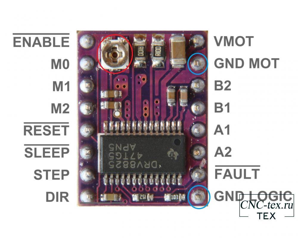 Перед использованием мотора нужно сделать небольшую настройку, необходимо ограничить максимальную величину тока, протекающего через катушки шагового двигателя, и ограничить его превышение номинального тока двигателя, регулировка осуществляется с помощью небольшого потенциометра.
