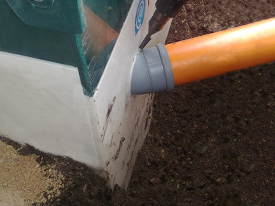 3) необходимо проделать отверстие под подводящую трубу в приемном отсеке канализационного комплекса. Делать это нужно аккуратно, чтобы не нарушить вертикальное пространство, необходимое для вставки. Нет ограничений по горизонтальной резке. Вариант «Стандарт» канализационной системы Astra обеспечивает максимальное расстояние от земли равное 0,6 м, вариант «Миди» — 0,9 м, вариант «Длинный» — 1,2 м. Также капают канаву для прокладки напорной и напорной труб… Сливная труба выходит из канализации и идет в цистерну вырытого колодца.
