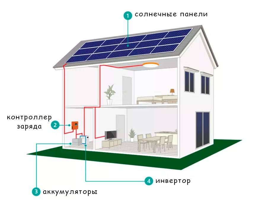 Все потребители переменного тока (бытовые электроприборы, электроинструмент и т. д.) не имеют прямого подключения ни контроллеру, ни к солнечным панелям. Они через инвертор подключаются к аккумуляторной батарее.