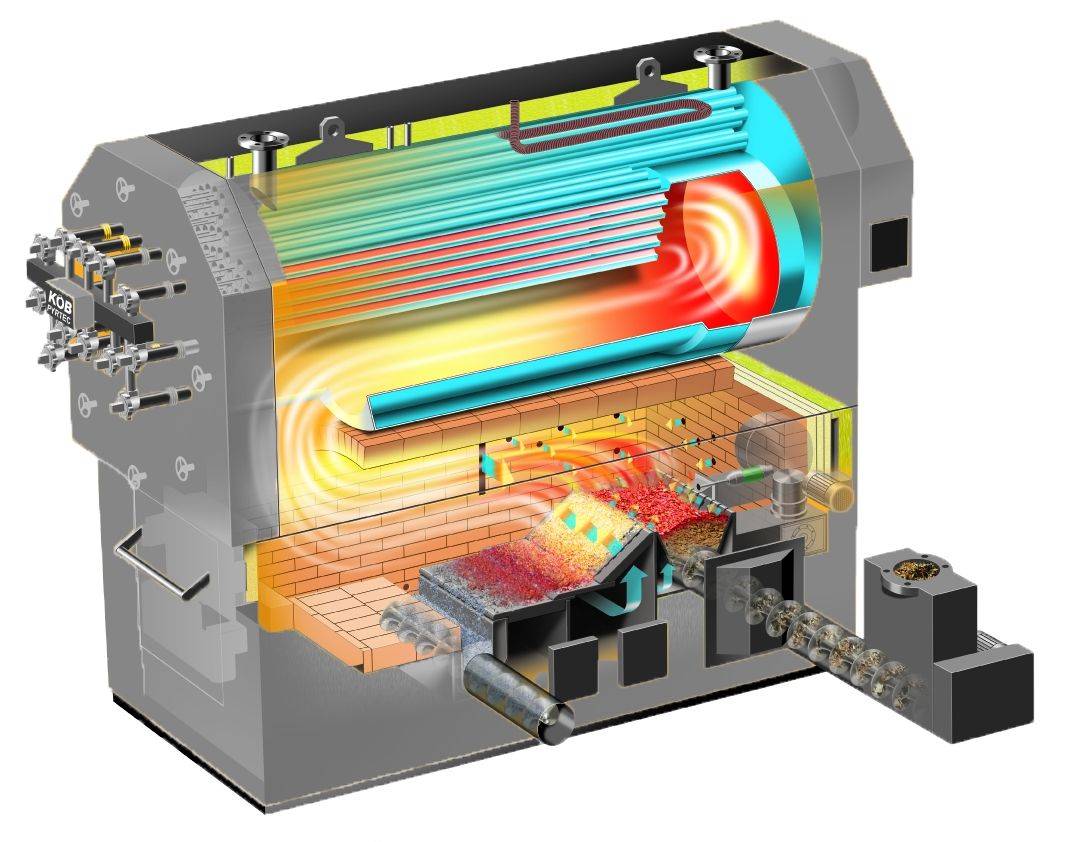 Газовые и жидкотопливные котлы сжигают топливо с помощью горелок, электрические кипятят воду ТЭНами (трубчатыми электрическими нагревателями) или электродами, твердотопливные используют естественное горение. Некоторые модели паровых котлов оборудуются вентиляторами для наддува, интенсификации горения и удаления дыма.