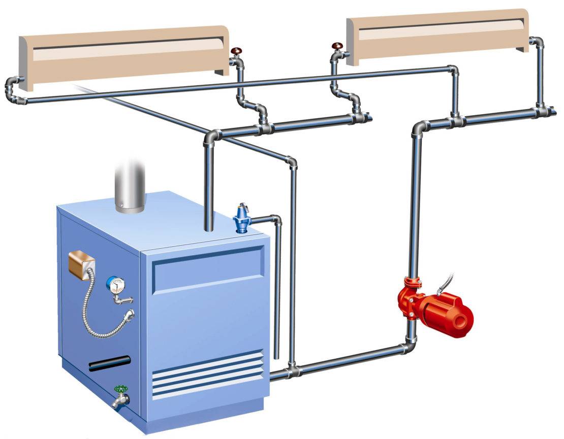Основой частью системы этого вида отопления является то место, где закипает вода − котел. В котел подается топливо, благодаря которому вода закипает и превращается в пар. В коллекторе подачи создается давление и пар поступает в трубы. а по трубам к радиатору. Конденсируясь, пар снова поступает в котел.
